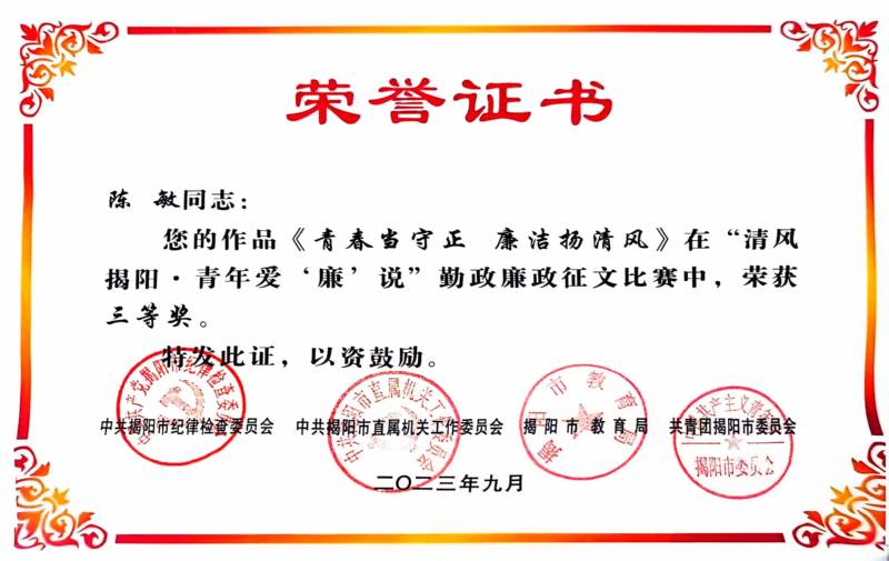 陳敏同志榮獲“清風(fēng)揭陽(yáng)·青年愛‘廉’說(shuō)”勤政廉政征文比賽三等獎(jiǎng)